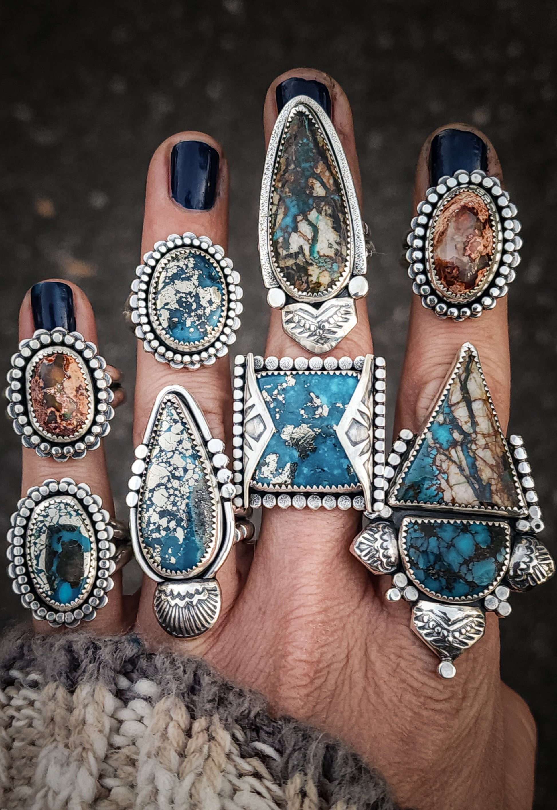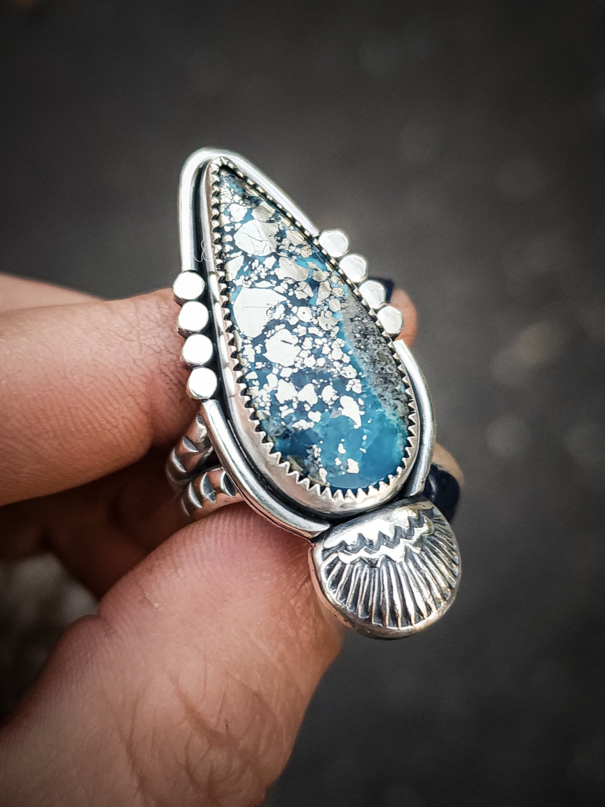 This ready-to-ship design - Conic Ring showcases Persian Turquoise. Featuring serrated bezel wire, silver wire and hand stamped shell border, finished on half round ring band for extra comfort.
