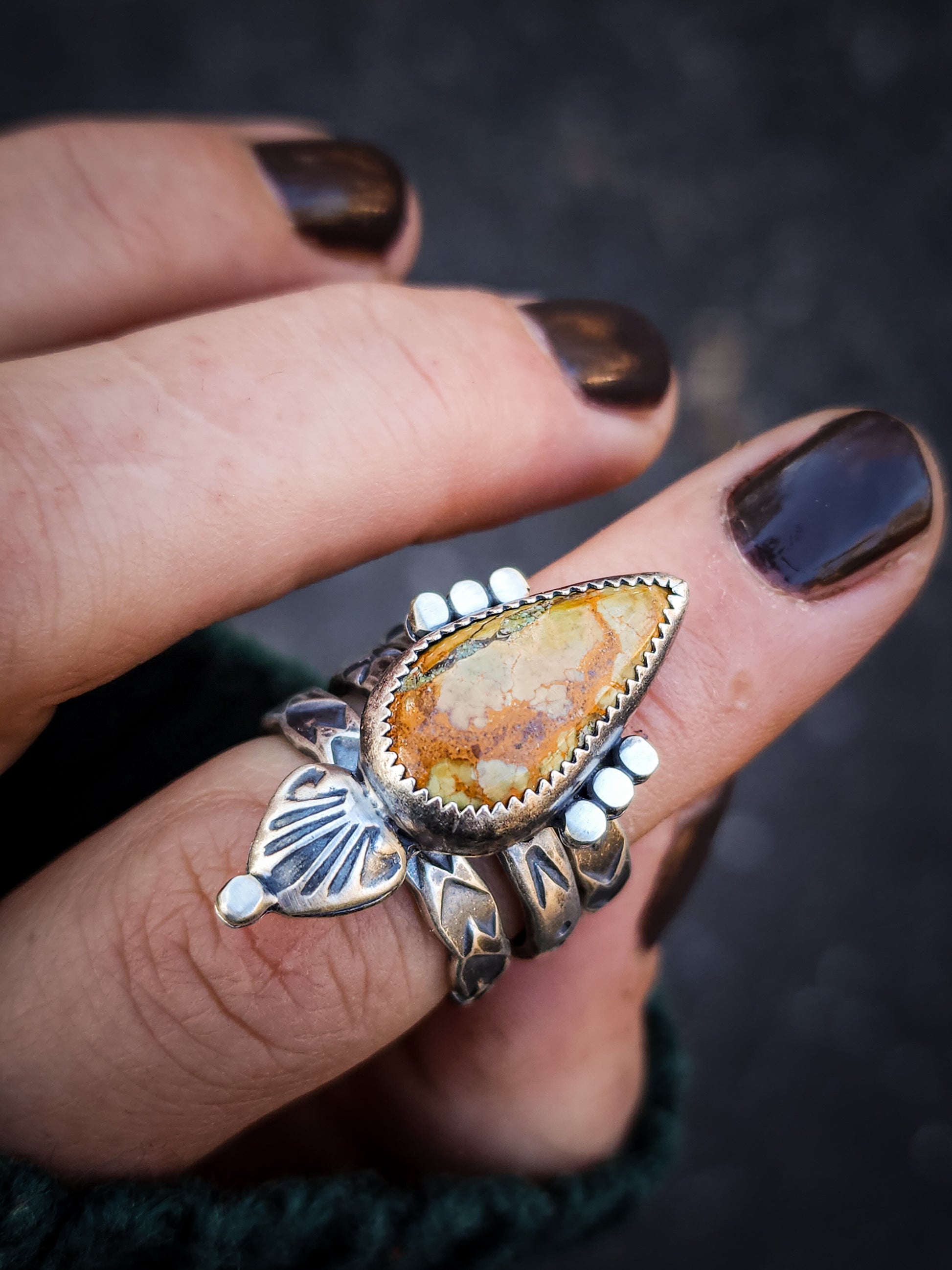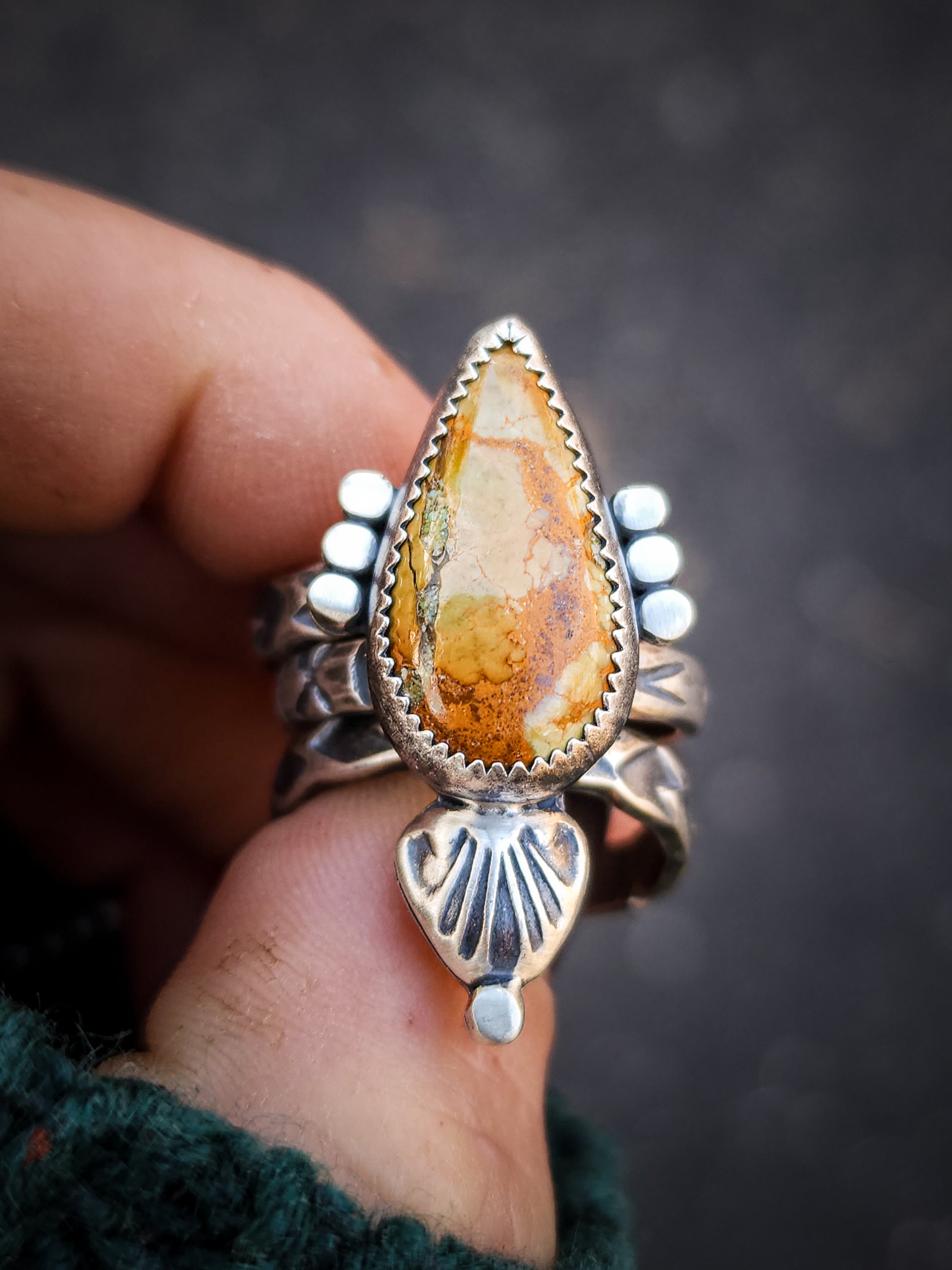 This ready-to-ship design - Conic Stamped Stackers showcases Evans Turquoise mined in Baja California, Mexico. Featuring serrated bezel wire, dotted silver wire, hand stamped accent and finished on a single hand-stamped band. Two additional stamped bands are included to complete the stacking set. Please note that when wearing all 3 rings together, the set will fit 1/2 size smaller than each ring size. Please size up 1/2 a size if needed.