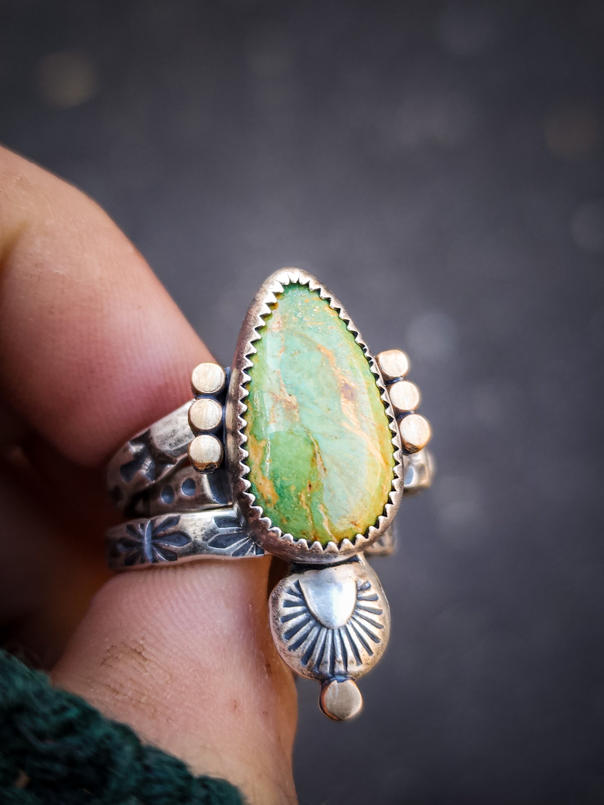 This ready-to-ship design - Conic Stamped Stackers showcases Evans Turquoise mined in Baja California, Mexico. Featuring serrated bezel wire, dotted Rose Gold wire, hand stamped accent and finished on a single hand-stamped band. Two additional stamped bands are included to complete the stacking set. Please note that when wearing all 3 rings together, the set will fit 1/2 size smaller than each ring size. Please size up 1/2 a size if needed.