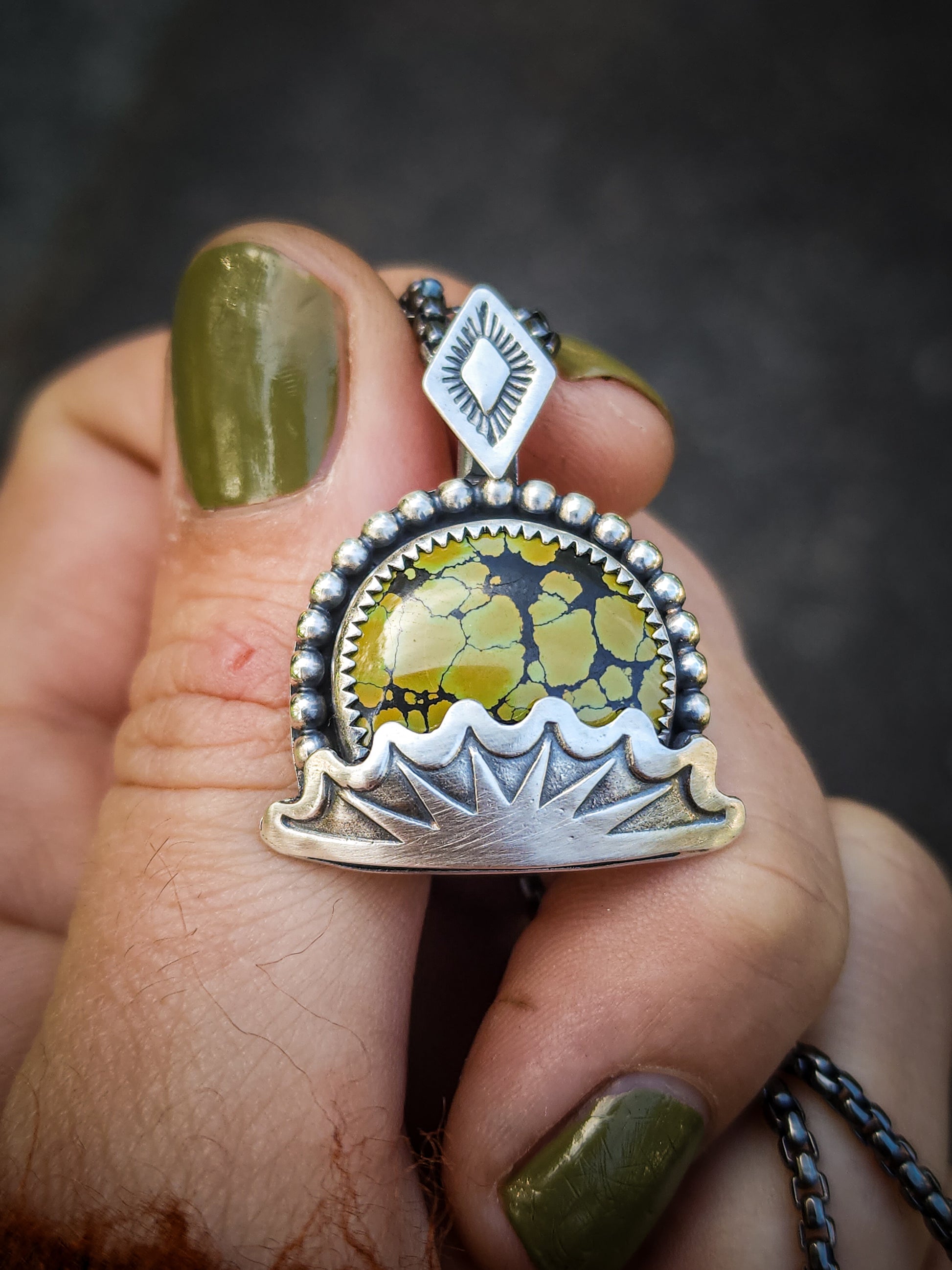 This ready-to-ship design - Harvest Sun Pendant showcases Hubei Turquoise mined in China. Featuring serrated bezel wire, hand stamped accent to resemble sun rays, dotted silver wire, hand stamped bail and finished on a sterling silver 20 inch chain.