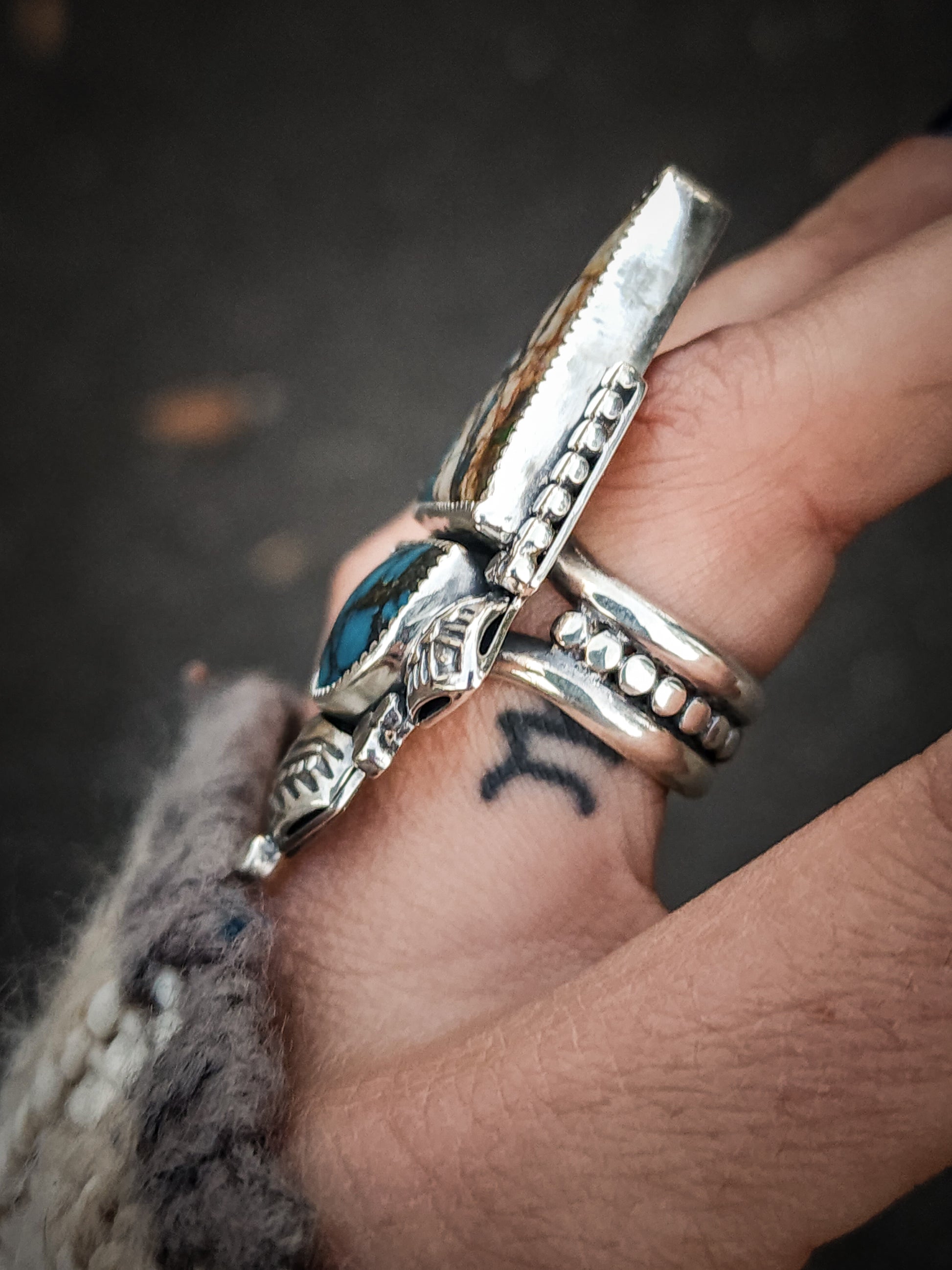 This ready-to-ship design - Pinnacle Ring showcases Royston Ribbon and Hubei Turquoise. Featuring serrated bezel wire, hand stamped accent, silver dotted wire and finished on triple round ring band for extra comfort. **please note that the stone setting is slightly crooked - discount has been added**