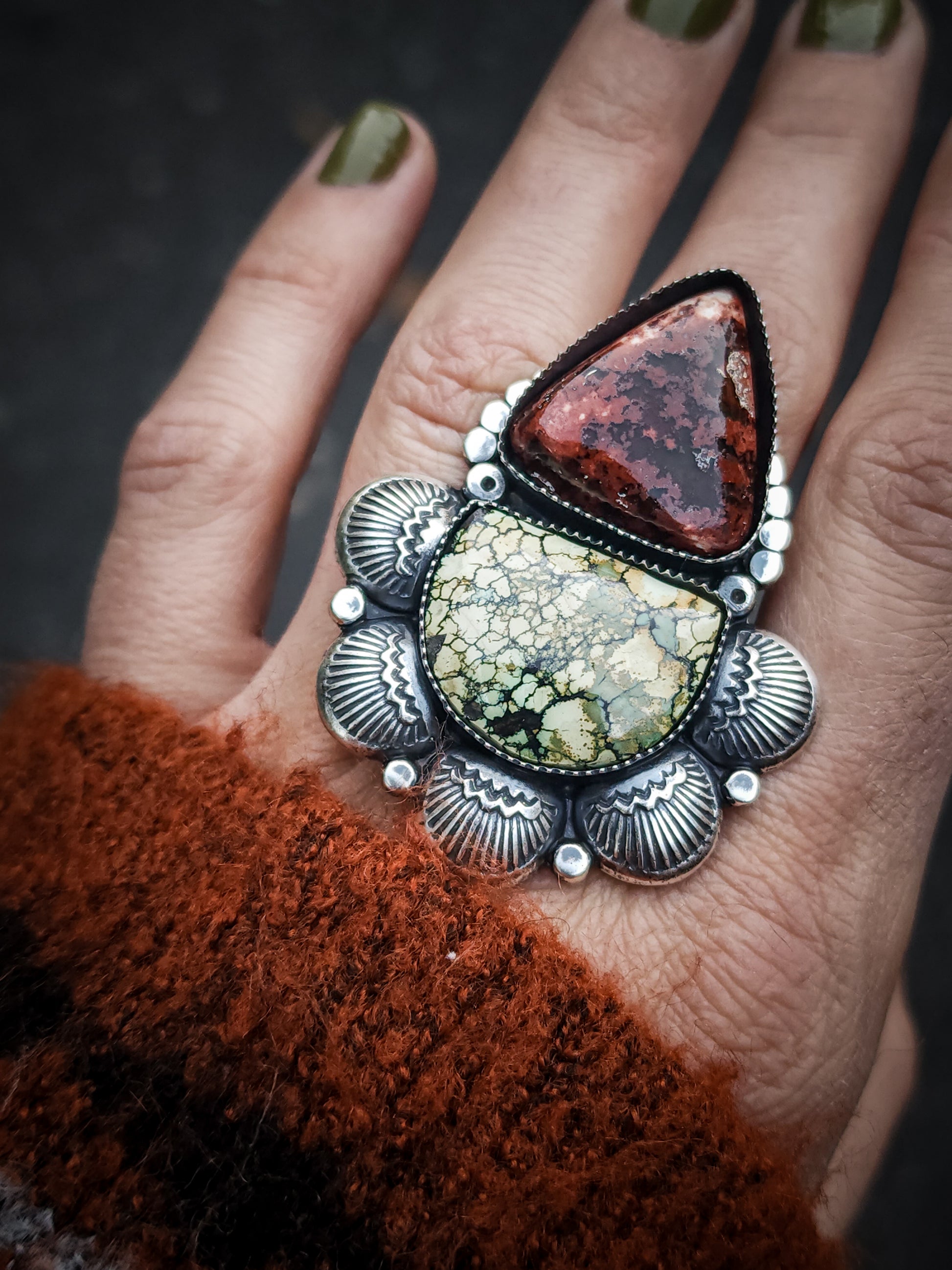 This made-to-size design - Ophelia Ring showcases Mexican Fire Opal and Hubei Turquoise. Featuring serrated bezel wire, accented with hand stamped shells, dotted silver wire and will be finished onto a double ring band. This is a made to size ring - please send an email following purchase to confirm desired ring size.