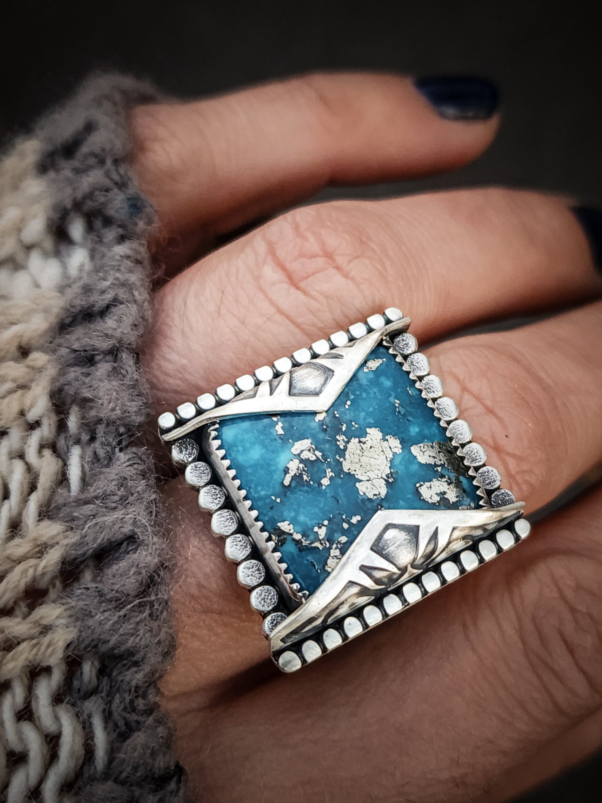 This ready-to-ship design - Pinnacle Ring showcases Persian Turquoise. Featuring serrated bezel wire, hand stamped accent, silver dotted wire and finished on half round ring band for extra comfort.