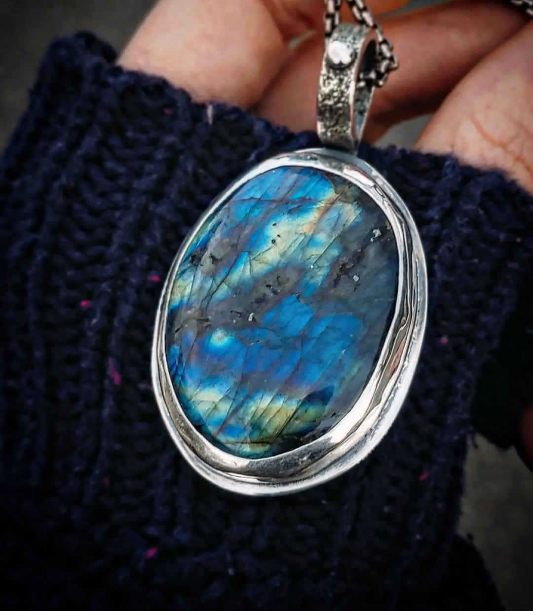 This one-of-a-kind Fenestra Statement Pendant features a hunky Labradorite that was carefully hand-sourced and selected specifically for this design. This open back pendant allows for light to shine through the Labradorite to provide more 'flash'.