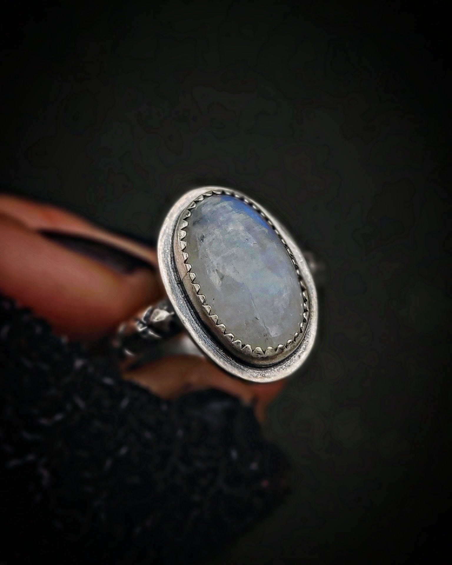This one-of-a-kind Nordic Ring features Rainbow Moonstone that was hand-sourced and selected specifically for this design. It features serrated bezel wire, soldered onto a hand stamp, half-round ring band.