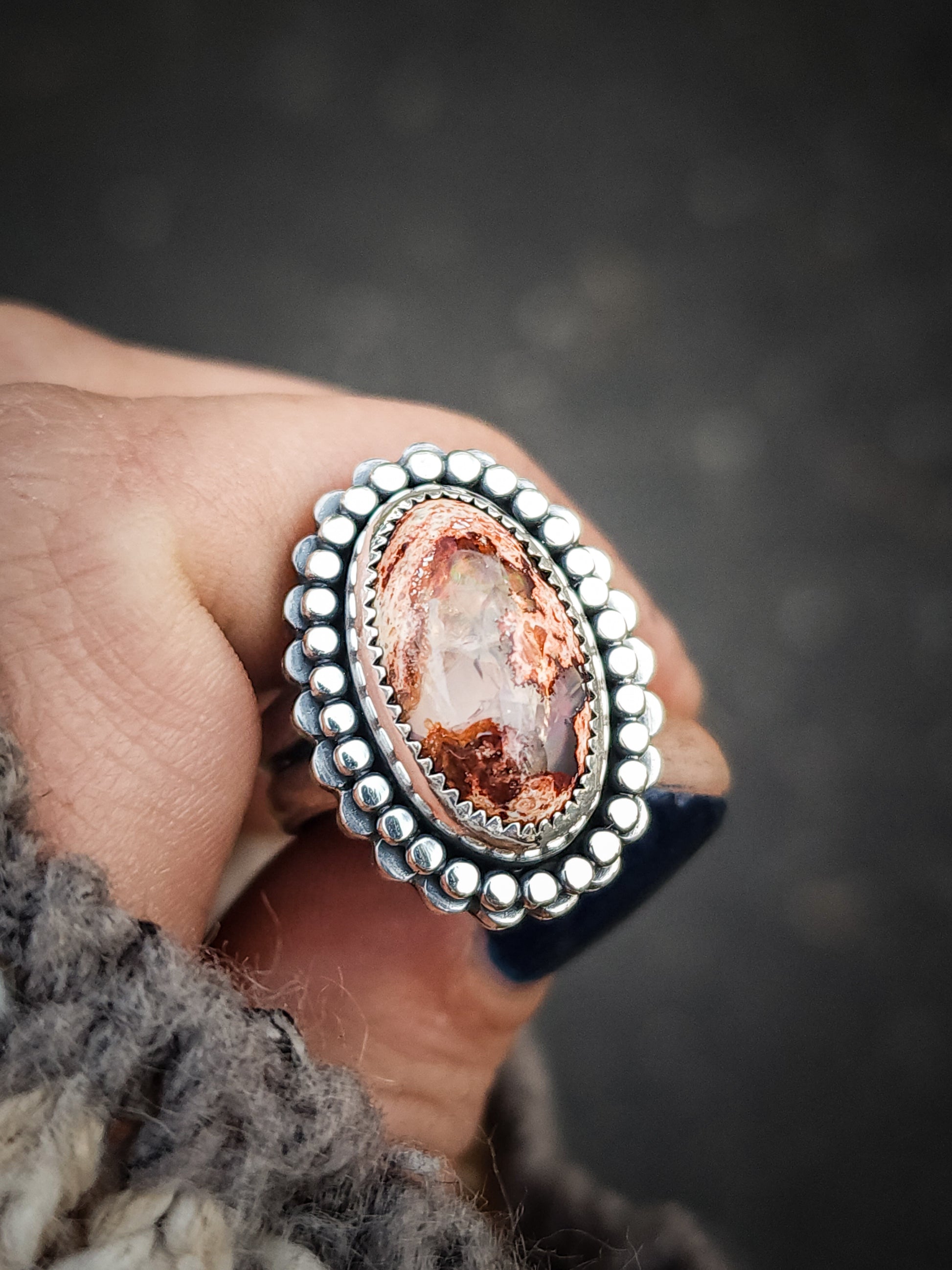 This ready-to-ship design - Winter Flower Ring showcases Mexican Fire Opal. Featuring serrated bezel wire, double sterling silver dotted wire and soldered onto a double, half round ring band for extra comfort.