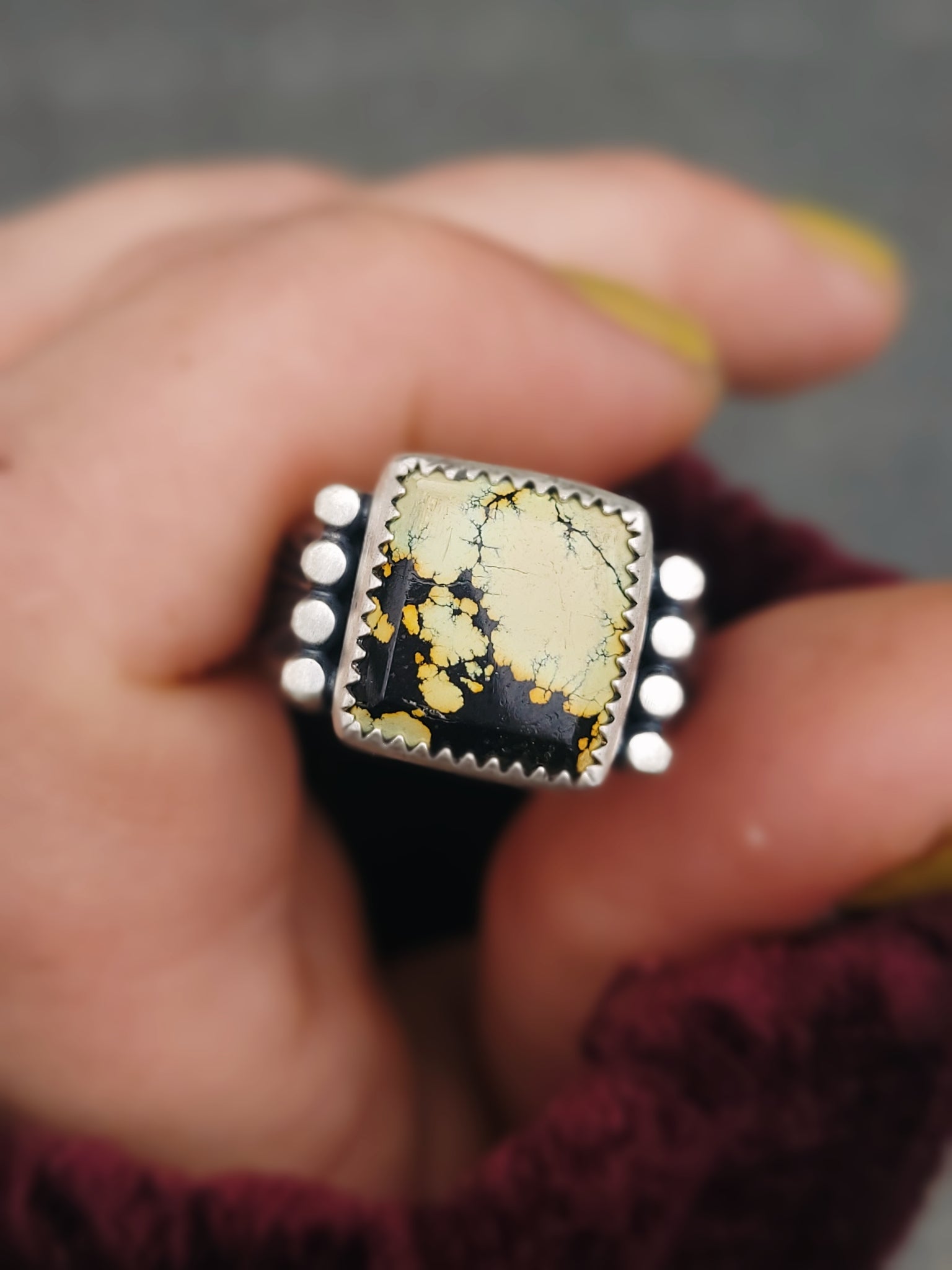 This one-of-a-kind MRH classic - XxtraaThicc Stamped Ring showcases Treasure Mountain Turquoise mined in China. Serrated bezel wire soldered onto 0 gauge sterling silver half-round ring band that has been rolled flat, accented with sterling silver dotted wire and hand stamped with one-of-a-kind designs. True to size.