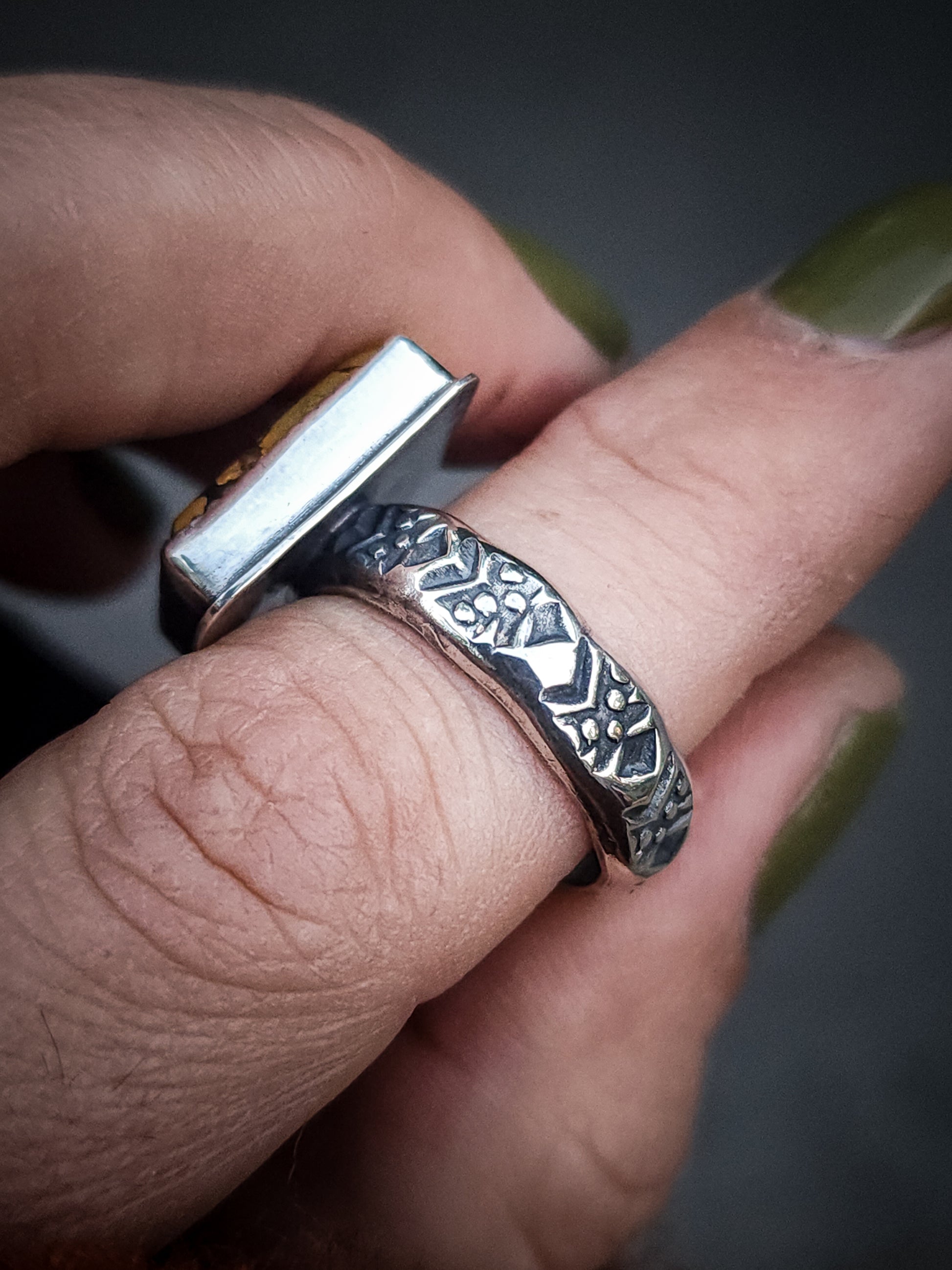 This ready-to-ship design - XxtraThicc Stamped Ring showcases Hubei Turquoise mined in China. Featuring serrated bezel wire and finished onto an extra thick, hand stamped ring band extra comfort.