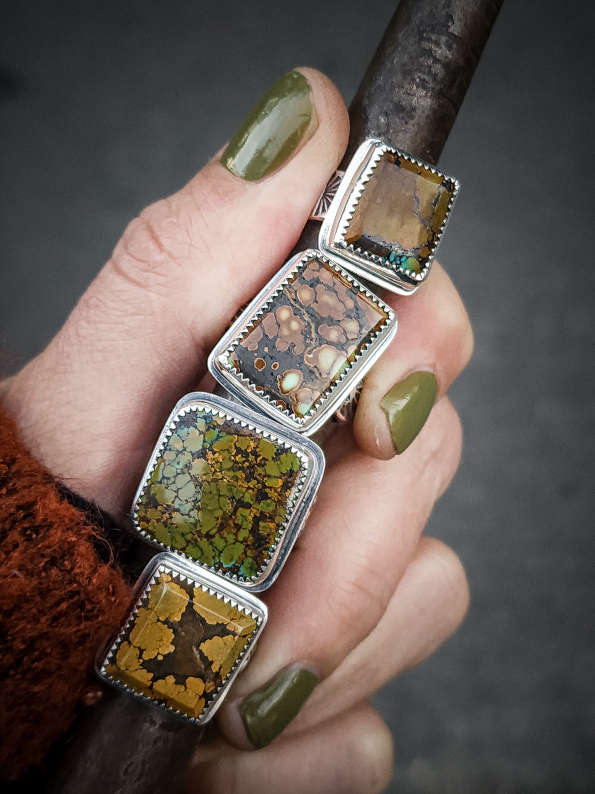 The 5th annual Autumn Rays Collection is finally here folks! Hand selected turquoise stones to embrace the rich, earthy tones of autumn's palette where golden ambers, deep russets, and burnt siennas complement the natural beauty of each one-of-a-kind piece. Please note if the item is ready-to-ship or MTO.