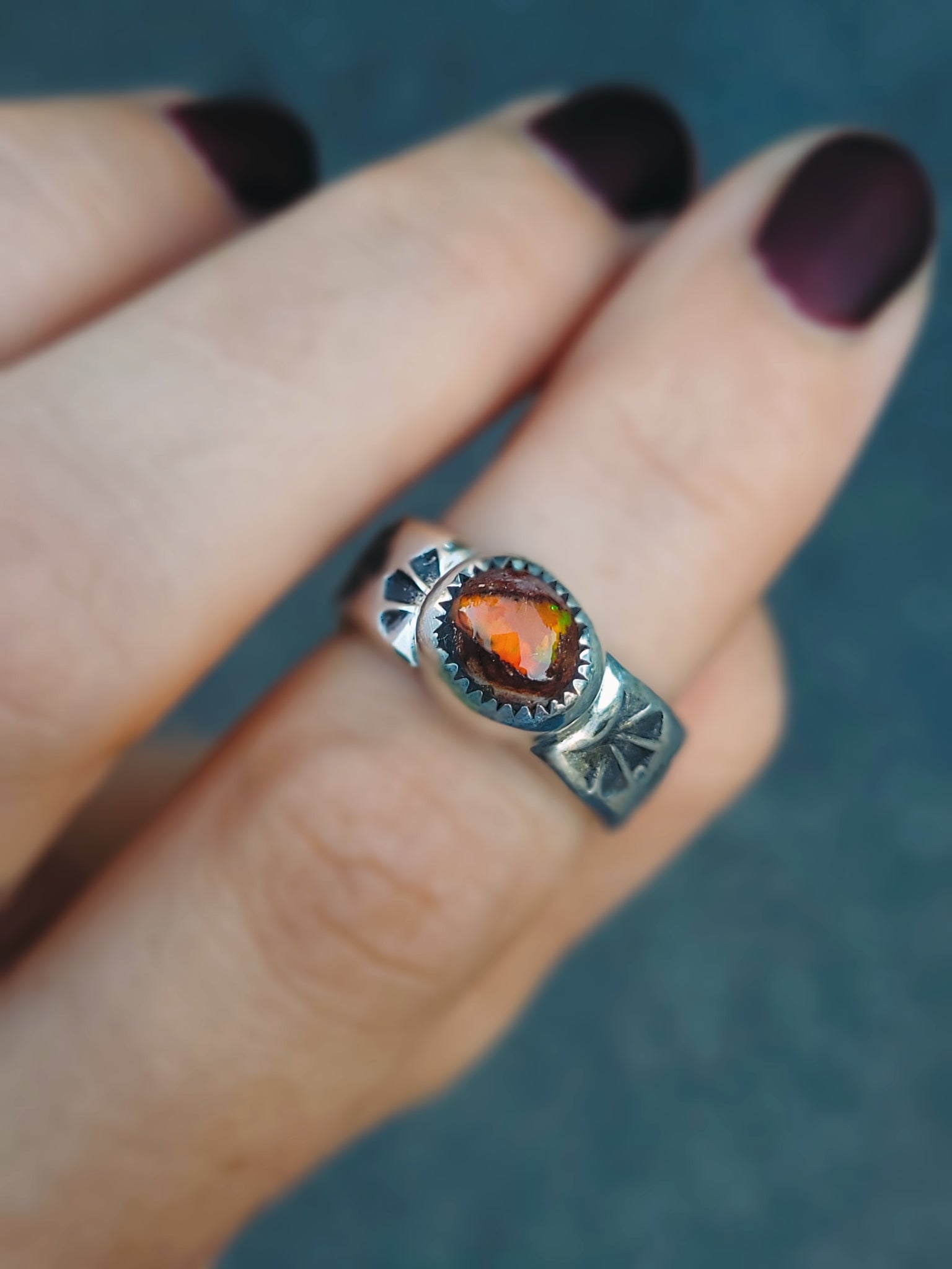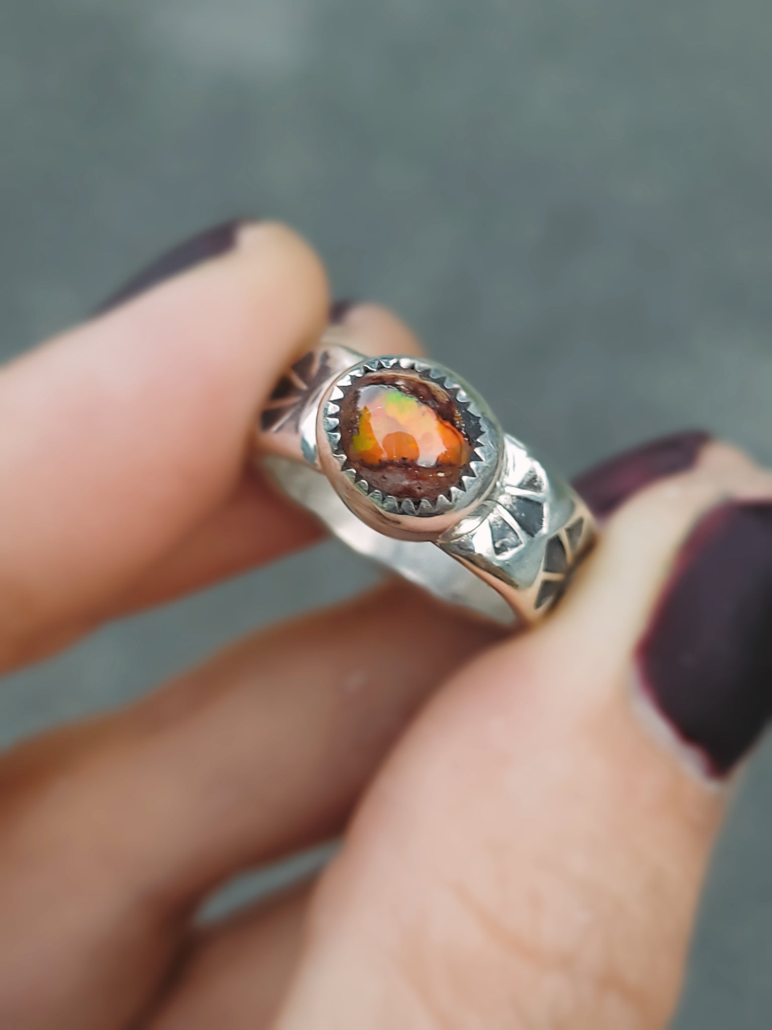 This one-of-a-kind XxtraaThicc Stamped Ring showcases Mexican Fire Opał mined in Mexico. Serrated bezel wire soldered onto a hand-stamped extra thick 2 gauge sterling silver wire. True to size. ((this listing will not mail out until Tuesday - August 16th at the earliest))
