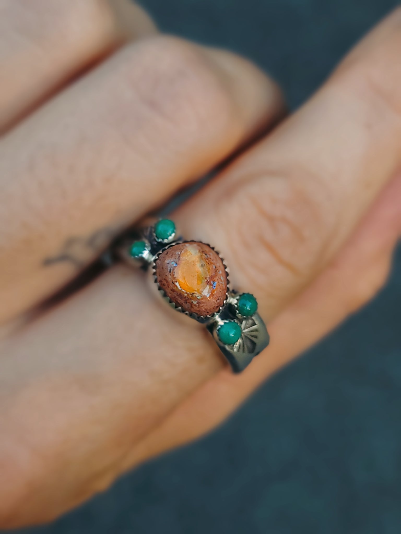 This one-of-a-kind XxtraaThicc Stamped Ring showcases Mexican Fire Opał mined in Mexico. Serrated bezel wire soldered onto a hand-stamped extra thick 2 gauge sterling silver wire. True to size. ((this listing will not mail out until Tuesday - August 16th at the earliest))