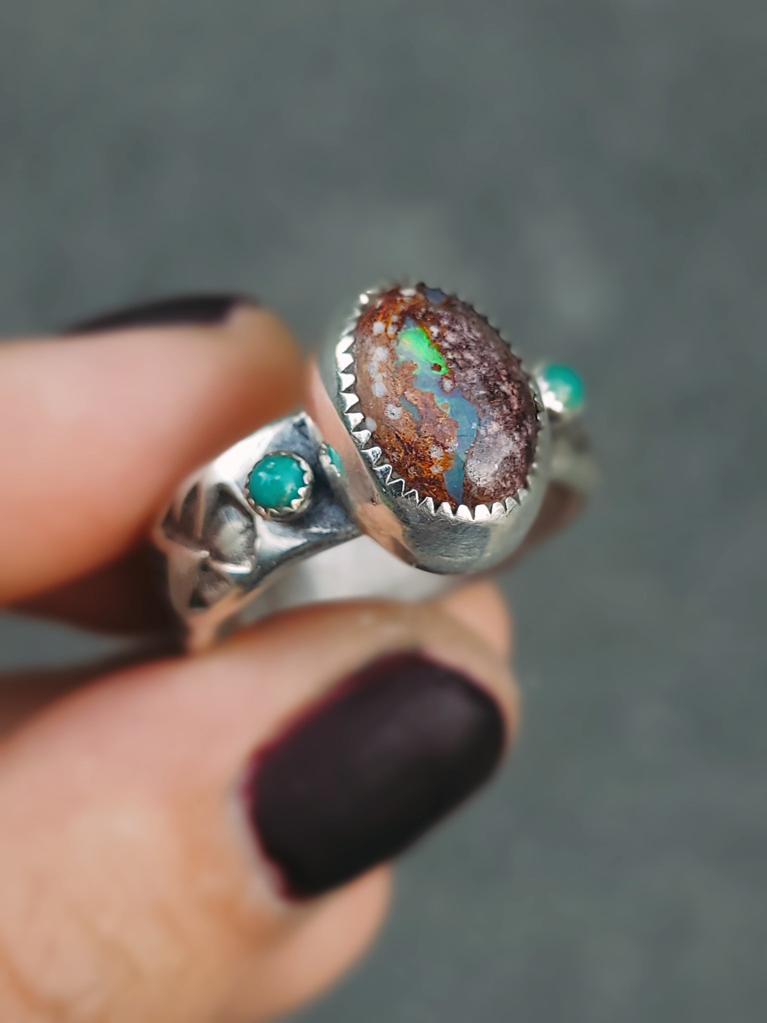 This one-of-a-kind XxtraaThicc Stamped Ring showcases Mexican Fire Opał mined in Mexico. Serrated bezel wire soldered onto a hand-stamped extra thick 2 gauge sterling silver wire. True to size. ((this listing will not mail out until Tuesday - August 16th at the earliest))
